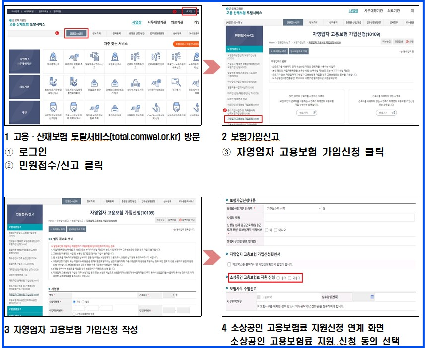 근로복지공단 ‘고용·산재보험 토탈서비스’ 홈페이지에서 고용보험 가입 & 지원금 신청을 함께 진행하면 됩니다.