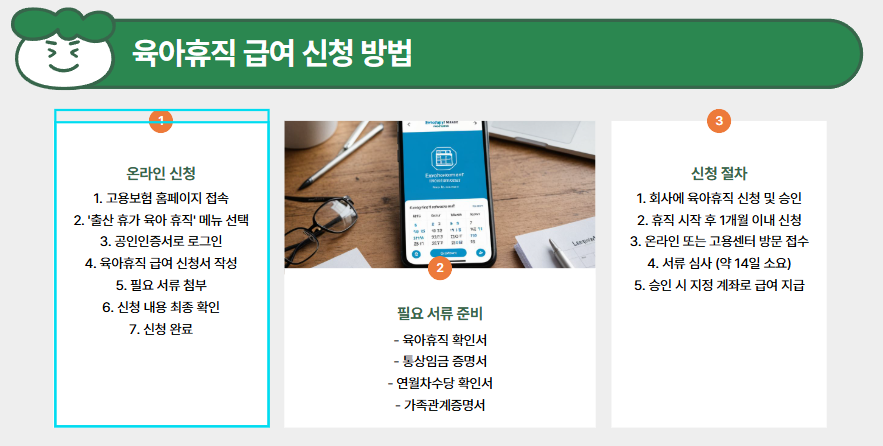 2️⃣ 필수 서류 준비 – 육아휴직 신청서, 급여명세서, 통장 사본 등을 준비해야 합니다.