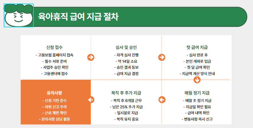✅ 복직 후 추가 지급: 육아휴직 후 6개월 이상 근무하면 지급액의 25%를 일시불로 지급합니다.